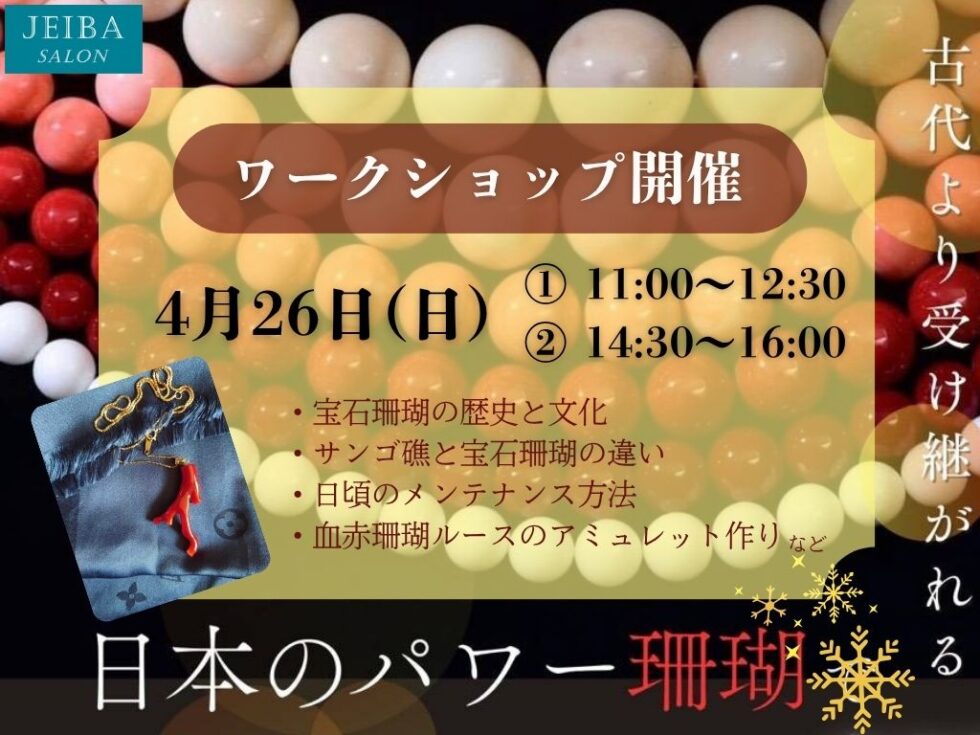 古代より受け継がれる 日本のパワー珊瑚で幸運作り 古来より“魔除け・厄除け”として大切にされてきた宝石珊瑚。知るほどに奥深い日本の宝石・珊瑚の世界、そして日々のお手入れのコツまで、特別講師 コーラルコンシェルジュ 大橋雅 […] -